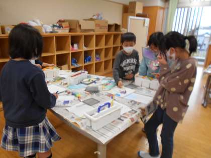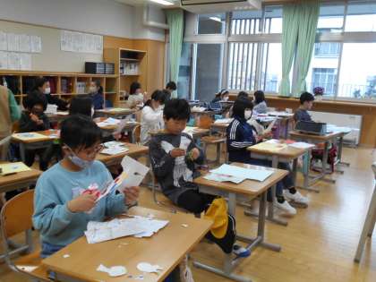 様々な表し方で作った模様を貼り合わせて、作品を作りました。友達が作った模様を見て、「すてきだね」と声をかけ合っていた子供たち。すてきな作品ができましたね。学習参観でいらした際に、是非、ご覧ください。