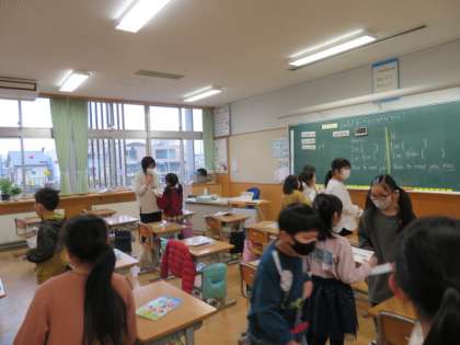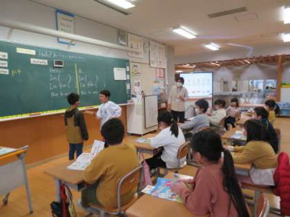 外国語活動で、レイシェル先生からローマ字の名前カードをいただきました。中には、自分の名前が読める子もいました。Helloの表現を使って、友達と楽しく挨拶することができました。
