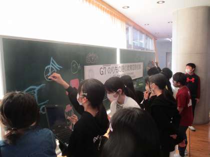 富山市で行われるG7教育相会合の機運を盛り上げる意味で、日本とスペイン、インドネシア、マレーシアをオンラインで結び、公共交通機関に関する子供会議を開催することが計画されています。日本の代表として、本校の6年生が選ばれて、昨年度から準備を進めています。