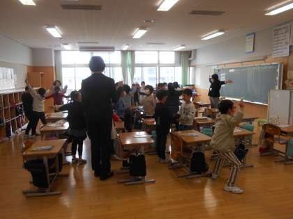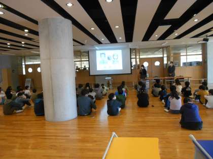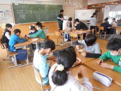その6年生は、昨日の2時間目に租税教室を行いました(左)。3年生の外国語は楽しそうでした(中)。5年生の国語はグループで取り組んでいました(右)。