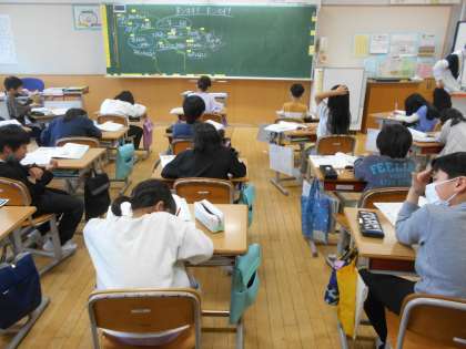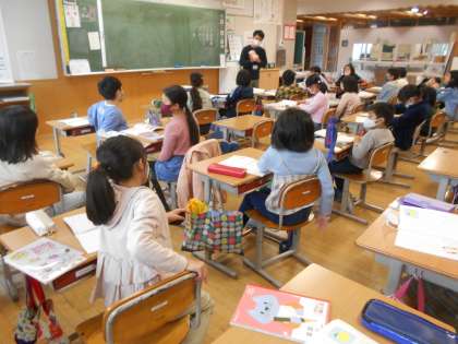 2年生が道徳で「ドンマイ!}について学習し(左)、4年生が「白いぼうし」で夏みかんを(中)、6年生が「読み聞かせ」で地球規模の貧困について学んでいます(右)。