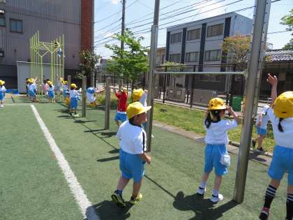 グラウンドを探検しました。ビオトープではアメンボやタンポポを見付け、自然を楽しみました。遊具の遊び方を覚え、順番を守って仲良く遊ぶことができました。