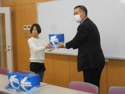 お昼には、体育委員長が企業から寄贈されたサッカーボールを受け取りました(右)。大切に使います。