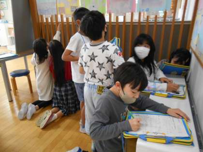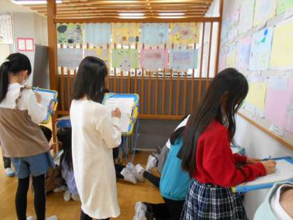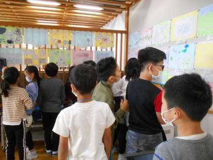 今日は、みんなの作品を鑑賞し、すてきなところを見つけていました。色使いや表現しているものに着目して、作品のよさを感じていたようです。