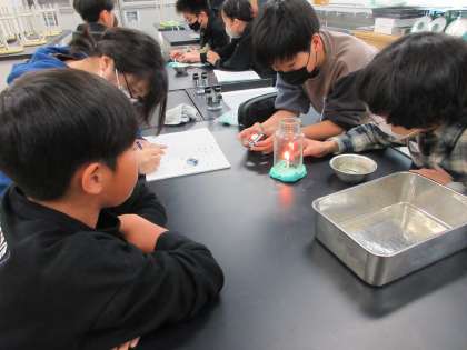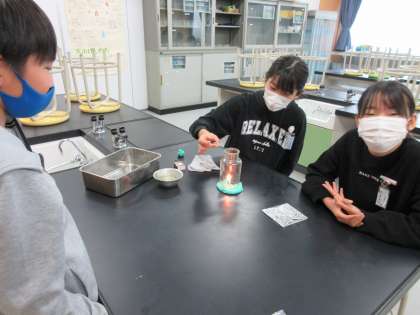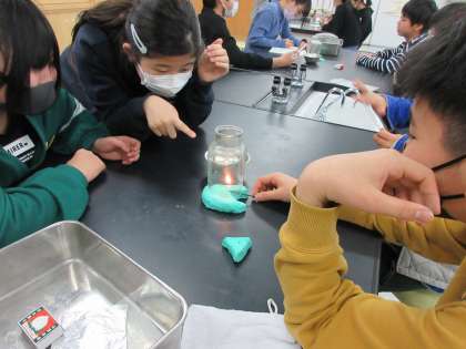 理科「物の燃え方と空気」の学習では、物が燃える条件について実験をしながら確かめています。マッチを使って火を付けるときは、より慎重になって安全にできるように声をかけ合う姿が見られました。