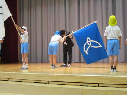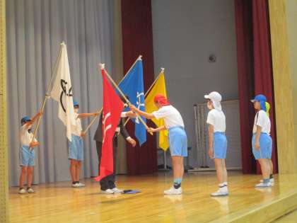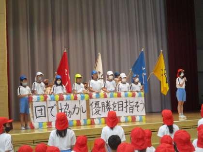 運動会の結団式を行いました。まず、体育委員会より、今年度の運動会のスローガン「団で協力し 優勝を目指そう」を発表した後、校長先生から各団長に団旗を渡していただきました。