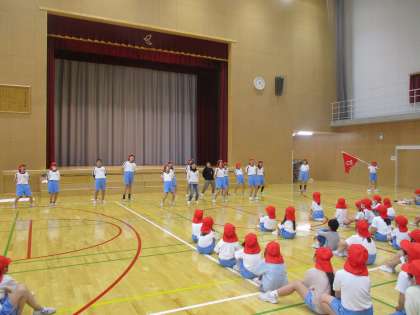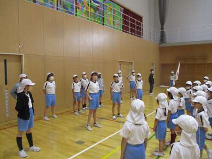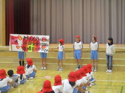 各団に分かれて、スローガンを発表しました。団役員の6年生は団の先頭に立ち、一人一人堂々と運動会の決意を述べていました。写真は赤団と白団の結団式の様子です。