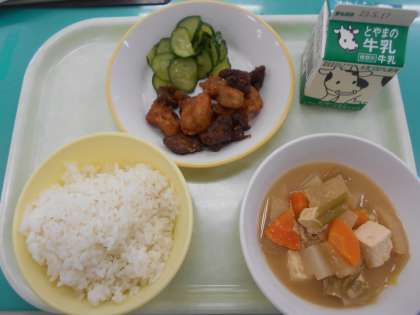 本日の献立は、豚肉とレバーの揚げからめ、きゅうりもみ、ごまけんちん、です。