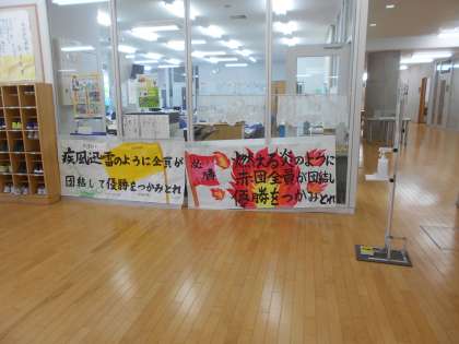 本校もお手伝いした「G7教育相会合」が予定されている12日(金)です。児童正面玄関も運動会モードです(左)。