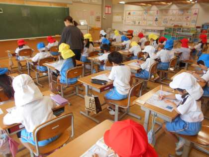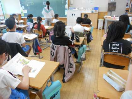 1年生も体育服を着ながら国語「ひらがな」の練習です(中)。4年生は道徳を頑張っていました(右)。