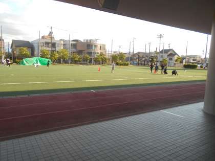 昨日の夕方、運動会に向けての準備を教員でした16日(火)です(左)。でも、今朝見てみると、もう人工芝上のテープがはがれてきていました。