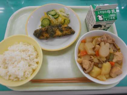 本日の献立は、魚の磯部揚げ、合わせ和え、筑前だき、です。
