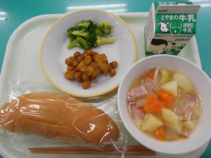 本日の献立は、鶏肉とひよこ豆のカレー風味、茹でブロッコリー、野菜のスープ煮、です。