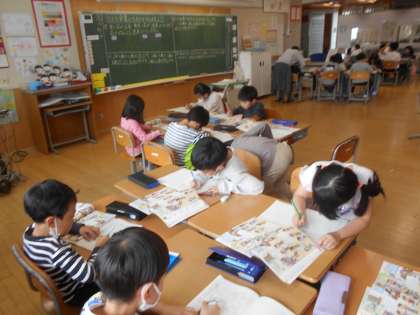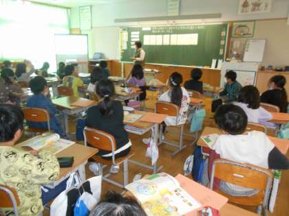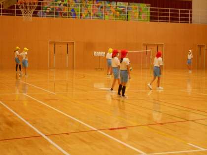 2年生は算数の問題をみんなで解いています(左)。4年生は外国語活動に挑戦しています(中)。6年生は体育でビーチボールに挑みます(右)。