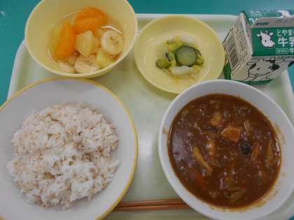 本日の献立は、たべキリンハヤシ、白菜サラダ、フルーツミックス、です。