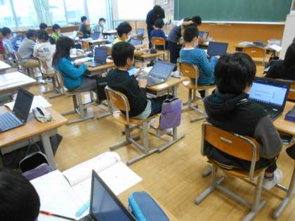 天候が気になる30日(火)です。2年生が体育で色々な用具を使った運動に挑戦です(左)。5年生はタブレットを使って学習していました(中)。