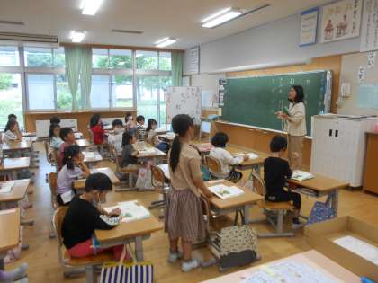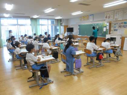 1年生の国語、ひらがな練習も佳境かな(中)?縦割り遊びを予定している6年生は学習も大変です(右)。