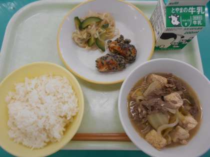 本日の献立は、ちくわの南部揚げ、甘酢和え、すき焼き、です。