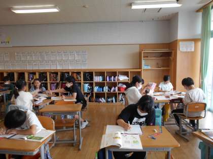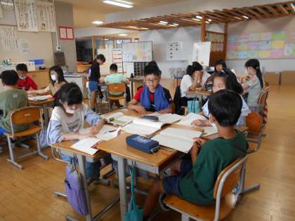 国語では「アップとルーズで伝える」の文章から筆者の考えを読み取り、自分の考えをまとめる学習をしています。必要な部分を引用しながら、考えを書き、班ごとに発表しました。
