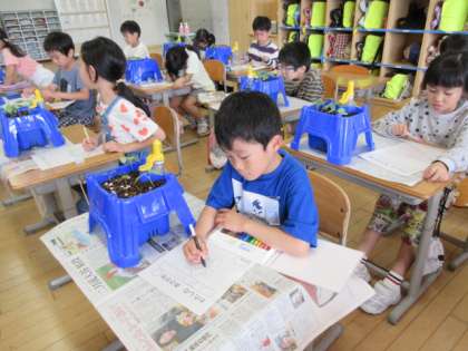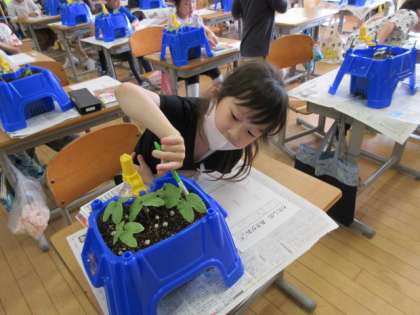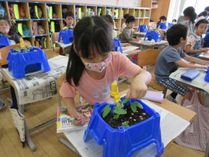 2組では、アサガオの芽の観察をしました。芽をじっくり観察すると、緑色だけではなく、紫色や赤紫色が混じっていることに気付きました。葉っぱの形を見た子供たちは、「ハートみたい」「ねこの顔に見えるよ」「ちょうちょに似ている」とお話してくれました。