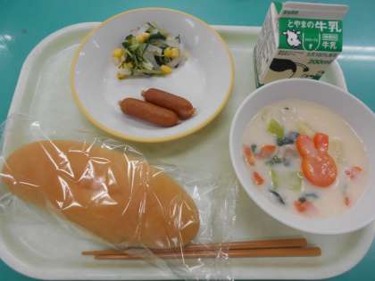 本日の献立は、あらびきウインナー、水菜のサラダ、クリーム煮、です。