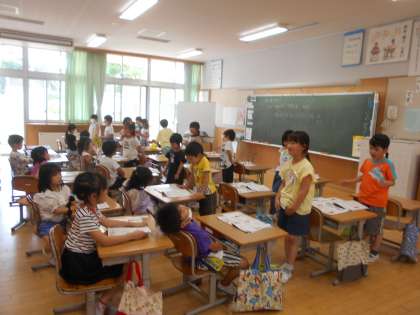 1年生は音読のグループ発表かな(左)、4年生はSDGsゲームをグループでやります(中)、2年生の体育のスポーツテストに挑戦です(右)