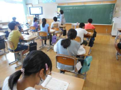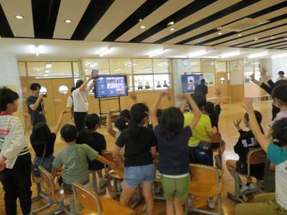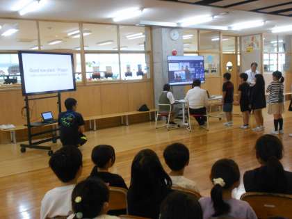 マレーシアとの交流翌日の7日(水)です。初めて全員がランチルームに集い、発表・質問をします。互いにユネスコスクールということで総合の取組を話し、とても良い雰囲気で進みました(左・中)。