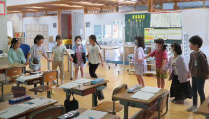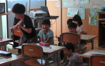 国語科「スイミー」の第3場面の情景を話し合った後、学級の子供たち全員で、海の中の生き物になりきって表現しました。