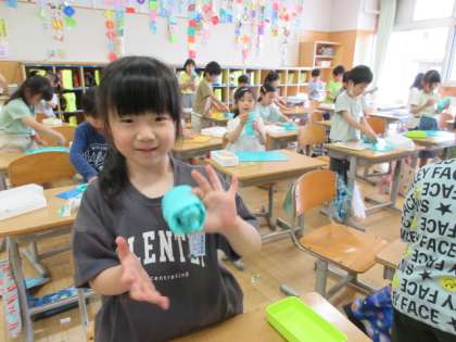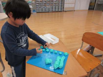 1年生になって初めて粘土を使いました。新品の四角い粘土をピザのように伸ばしたり、海苔巻きのように丸めたりしました。お団子を作った後は、大切にケースに片付けました。粘土を使った学習はこれからも続きます。