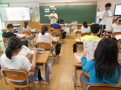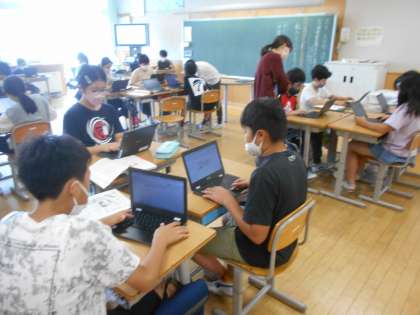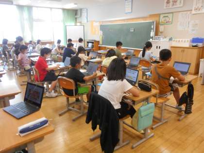 タブレットは、6年生のグループ学習、4年生の総合で活用していました(左、中)。5年生では外国語を学習していました(右)。