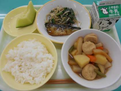 本日の献立は、いわしの生姜味、ほうれん草の胡麻和え、関東だき、メロン、です。