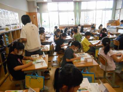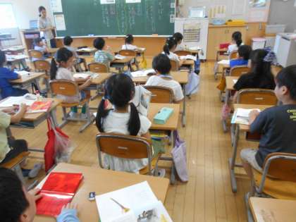 1年生の国語の様子と4年生の外国語です(左、中)。