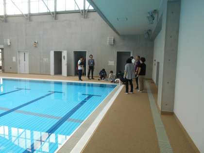新しい先生方を迎えてのプール講習をやりました。自慢のプールに歓声を挙げていました(右)。