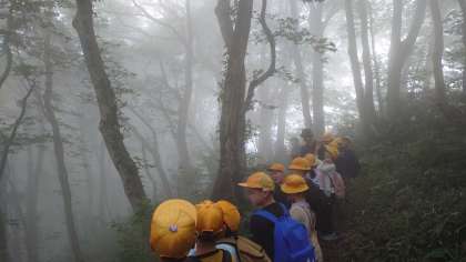霞に包まれて幻想的な雰囲気の中、下山しています。