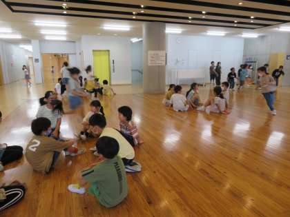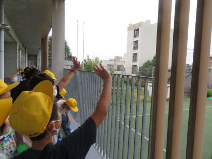 卵から幼虫、さなぎと育てたモンシロチョウの成虫を、みんなで空に戻しました。子供たちは、毎日餌の世話をし、様子もよく観察していました。名残惜しそうに空を舞っていたチョウに、みんな「元気でね」と手を振っていました。(左)今日の「なかよしタイム」は、ランチルームで「ハンカチ落とし」をしました。みんなとても楽しそうでした。(右)