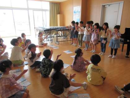 音楽の学習では、はくに合わせてリズムを叩きました。「しろくまのジェンカ」の曲に合わせて、楽しく手拍子をしました。