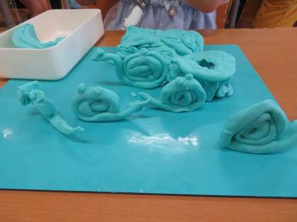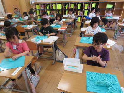 粘土をひも状にしてイメージしたものを作る学習をしています。長いひもや短いひも、太いひもや細いひも等、いろいろなひもを使いました。巻いてかたつむりにしたり、重ねてトンネルにしたりと、どんどんイメージが広がっていました。