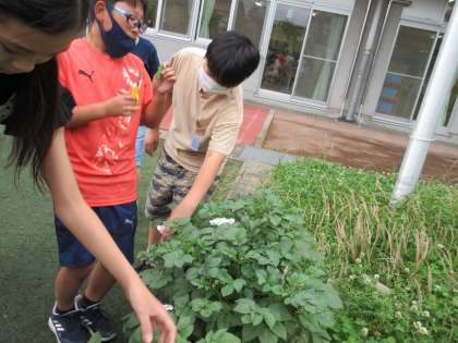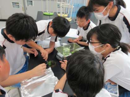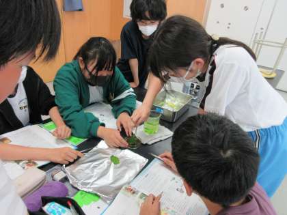 理科「植物のからだのはたらき」の学習では、植物の葉に日光が当たるとでんぷんができるのか実験をして確かめています。班で協力していくつかの結果を比べたり、詳しく観察したりしています。