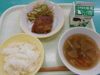 本日の献立は、魚の梅風味蒲焼き、茎わかめの中華和え、根菜スープ、です。