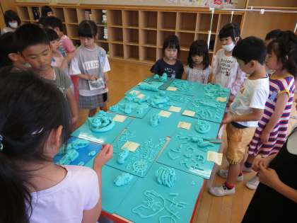 図画工作科「ひもひもねんど」で、友達の作品を見合う鑑賞の学習をしました。