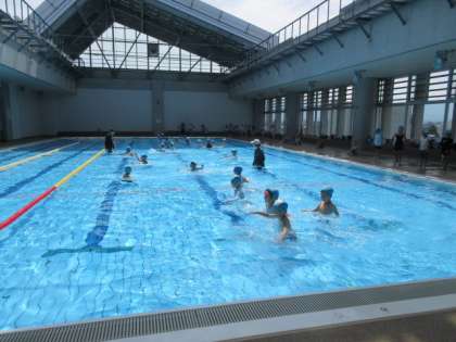 体育の時間にプールに入りました。水に顔をつけたり、水の中で様々な動きをしたりしました。