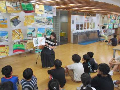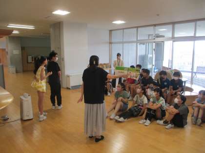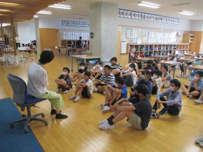 ひだまりの会の方による本の読み聞かせがありました。子供たちは朗読をじっくりと聴いたり、実際に体を動かしたりして、本の世界を味わっていました。