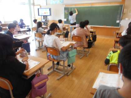 2年生が理科で学校の紫陽花を教室から観察し(左)、4年生が外国語を(中)、6年生は家庭科を(右)学習していました。