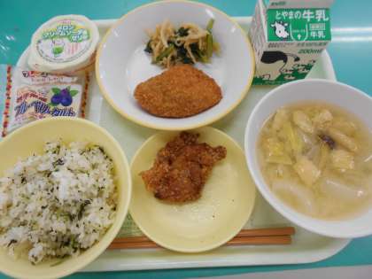 本日の献立は、(豚肉の香り揚げ・白身魚のフライ)、はりはり和え、みそ汁、(メロンクリームソーダゼリー・ブルーベリータルト)、です。