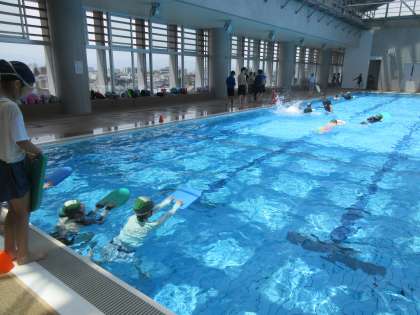 クロールや平泳ぎを練習しています。友達と動きを見合って、よいフォームを身につけようと取り組んでいます。
