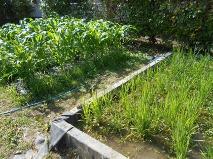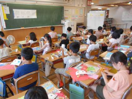 2年生が図工で仮面をつくっておどけていました(左)。同じく2年生が算数で「かさ」の学習に取り組んでいました(中)。こんな体感も算数では大切です。