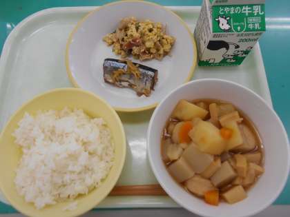 本日の献立は、秋刀魚のしょうがあじ、ベーコンとゴーヤの卵炒め、炊き合わせ、です。