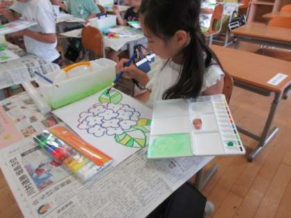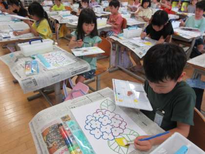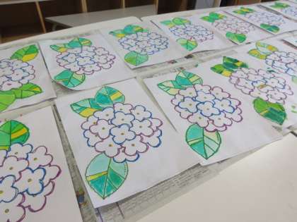 初めて水彩セットを使いました。道具の準備の仕方を確認したあと、あじさいの葉っぱを塗りました。色を少しずつ混ぜることで、色が変わっていくことが分かりました。