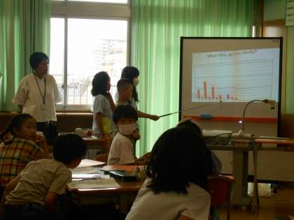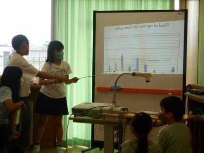 最後の外国語活動では、クラスのみんなが「○○を何時にしているか」をインタビューし、回答をグラフにまとめて発表しました。外国語で発表することは難しかったようですが、チャレンジしていました。