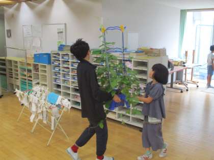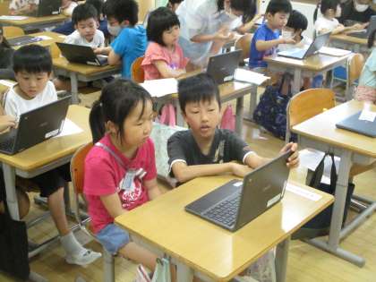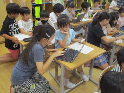 6年生は最高学年として1年生と関わりながら、学校生活のお世話をしています。今回はクロムブックの使い方を教えてあげたり、1年生が育てているアサガオの鉢の移動の手伝いをしたりしました。1年生に寄り添いながら優しく声をかける姿が多く見られました。